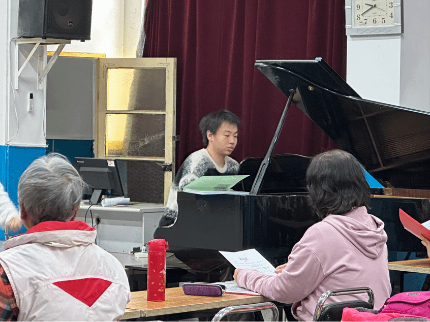 在敬老月活动的温馨氛围中,10月30日上午,我院学生柏淇舜与李安珂受邀前往校离退休处,为退休教师合唱团担任钢琴伴奏。用悠扬琴声为退休教师们的合唱时光增添温情,既践行了敬老爱老的传统美德,也让学子在实践中传递音乐的温暖力量。