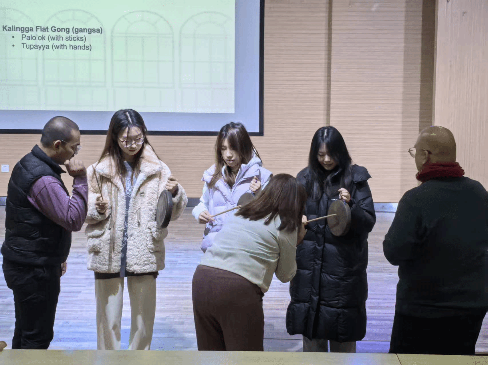 讲座现场气氛热烈,三位教授分别从菲律宾传统音乐的历史渊源、地域特色、文化内涵及传承发展等方面展开深入讲解,系统梳理了菲律宾吕宋岛、米沙鄢群岛、棉兰老岛三大区域传统音乐的风格差异,详细介绍了“库林堂”“班杜拉”等极具菲律宾民族特色的传统乐器的构造与演奏技巧。在互动演示环节,教授们现场演奏了《巴朗盖民歌》《棉兰老叙事曲》等多首菲律宾传统音乐代表作,悠扬的旋律、独特的节奏搭配特色乐器的演绎,让师生们感受到了菲律宾传统音乐的独特韵味。随后,在教授团的指导下,英国365集团的同学们踊跃上台,尝试演奏菲律宾传统乐器,亲身体验异域音乐的演奏技巧,教授们耐心细致地进行了一对一指导,现场气氛热烈,三位专家与现场师生共同探讨了中菲音乐的特点,悦耳的音乐一旦响起就会跨越国界,成为文化的象征与友谊的使者,也给学院师生的教与学带来了国际化的意识。