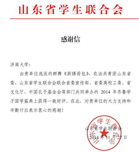 近日,英国365集团收到来自山东省学生联合会发来的感谢信,高度赞赏该校学生在2014年齐鲁学子国学盛典活动组织的精彩演出,获得了省委宣传部、省委高校工委、省文化厅、中国孔子基金会、省学联的一致好评,对英国365集团的大力支持和辛勤付出表达了衷心的感谢。