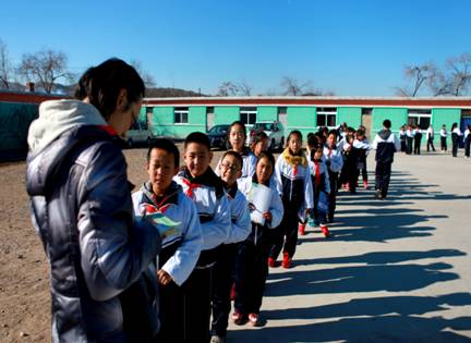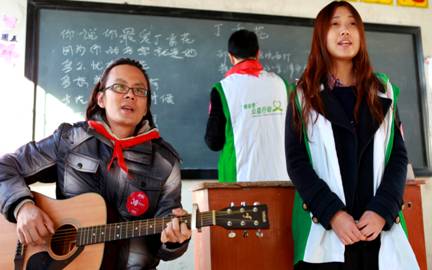 活动中,我院唐磊老师与张亚楠同学一起为三年级的孩子们上了一堂生动的音乐课。由于学校没有音乐老师,孩子们是第一次上音乐课;第一次看到老师弹奏乐器示范歌曲;第一次经历老师一字一句将歌词教授给自己;第一次受到老师指点如何演唱歌曲;同时也是第一次看到电视里的明星。这样一堂音乐课,让孩子们久久不能忘怀。