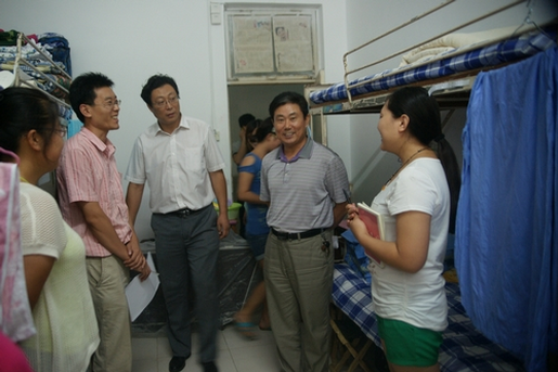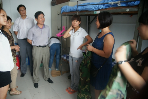 报到工作结束,共有165名来自全国各地2013级新生来到英国365集团,正式开始了大学的新生活。英国365集团的领导老师非常重视新生工作,学院党委书记赵道会带领学工人员和新生班主任到新生宿舍查看新生住宿环境,确保新生能住的安心、舒服,并且与新生进行了简短的交流,希望他们能够尽快适应校园的集体生活,希望他们以饱满的热情积极投入到大学生活中来。另外,也向新生强调了宿舍环境的重要性,希望新生能够培养自己的主人翁意识,营造温馨和谐的生活学习氛围。