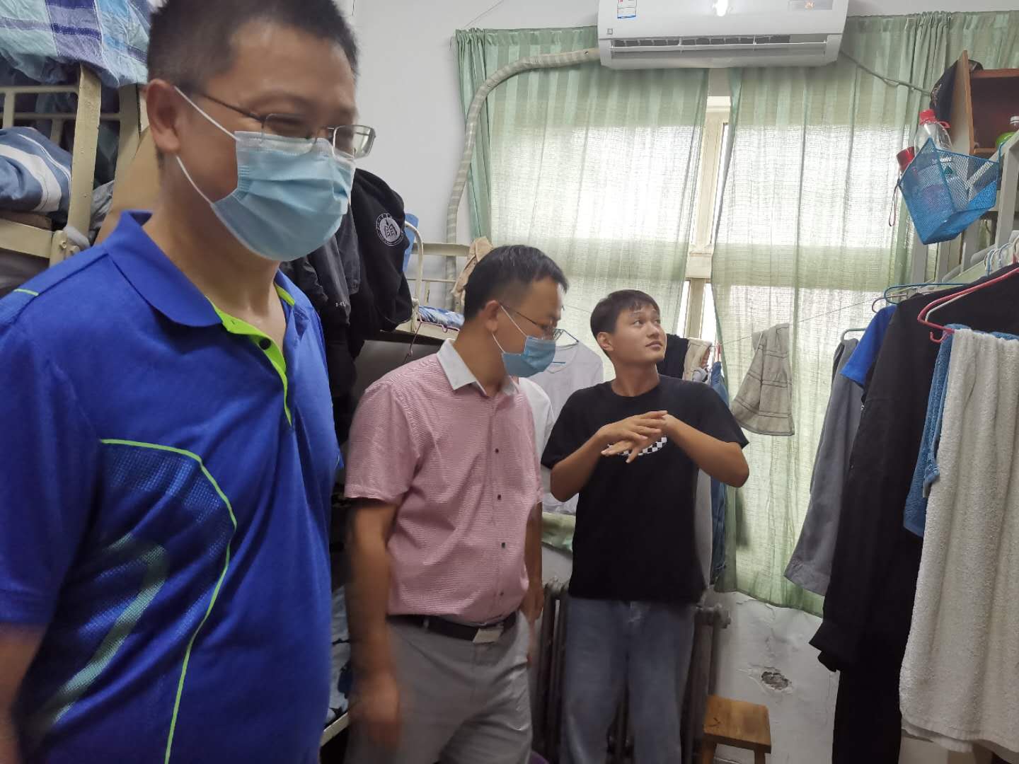 每到一间宿舍,领导老师们认真查看学生宿舍基础设施、环境卫生、安全情况,亲切询问学生的学习生活思想状况,叮嘱同学们要注意防护,科学防疫;要注意保持良好的宿舍卫生,定期通风、消毒、晾晒被褥,养成良好的生活习惯;强调个人要严格执行每日早中晚体温检测制度,同时注重劳逸结合,加强体育锻炼,将疫情防控工作做细做实。