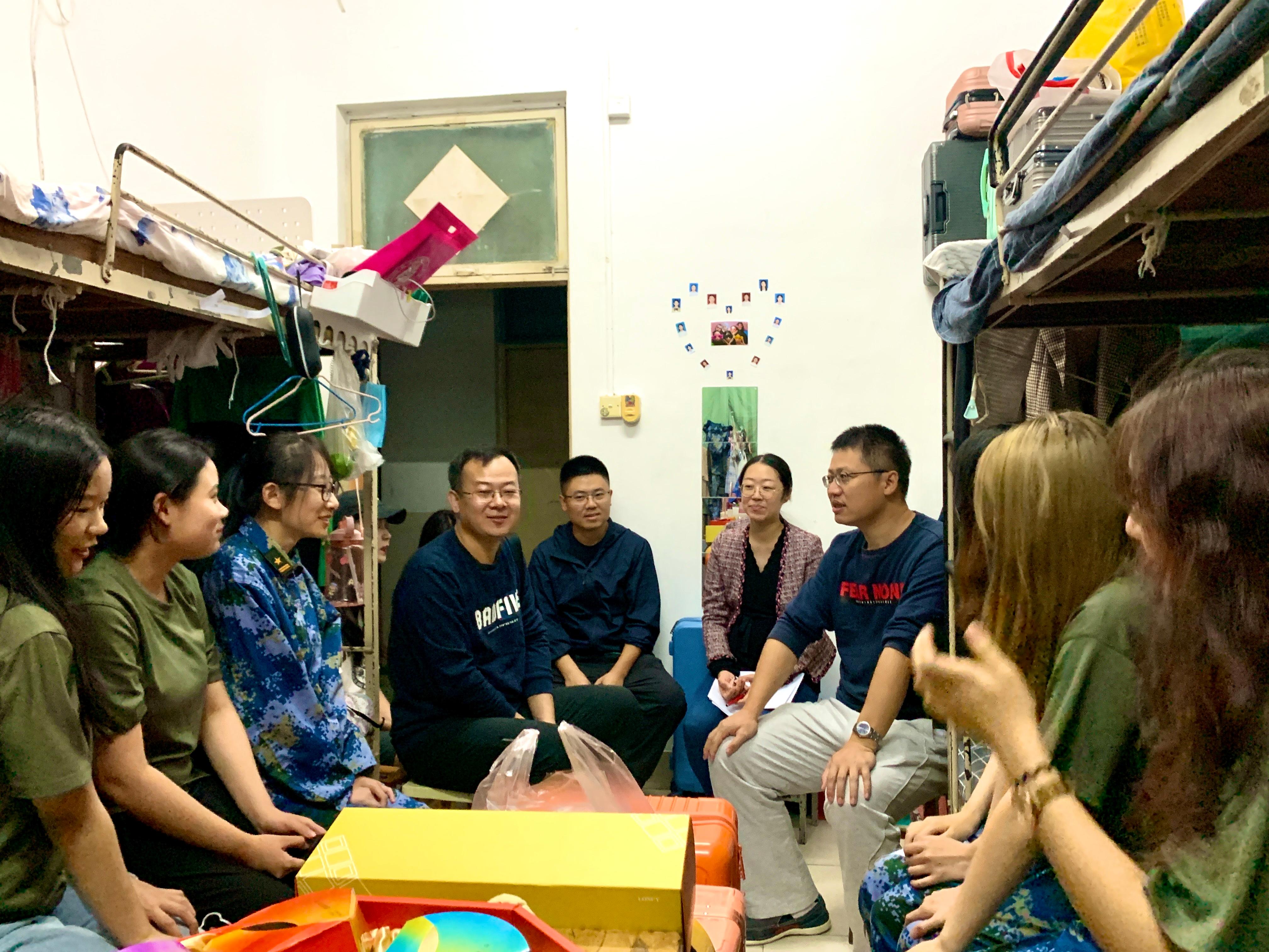每到一个学生宿舍,刘书记一行与学生进行亲切交谈,向第一次在大学过中秋节的新同学及家人致以节日的问候,并和他们聊起了家常:“给没给家里打电话”、“想不想家”。看到学院老师的到来,学生们没有一点陌生感,就像见到自己的家人。