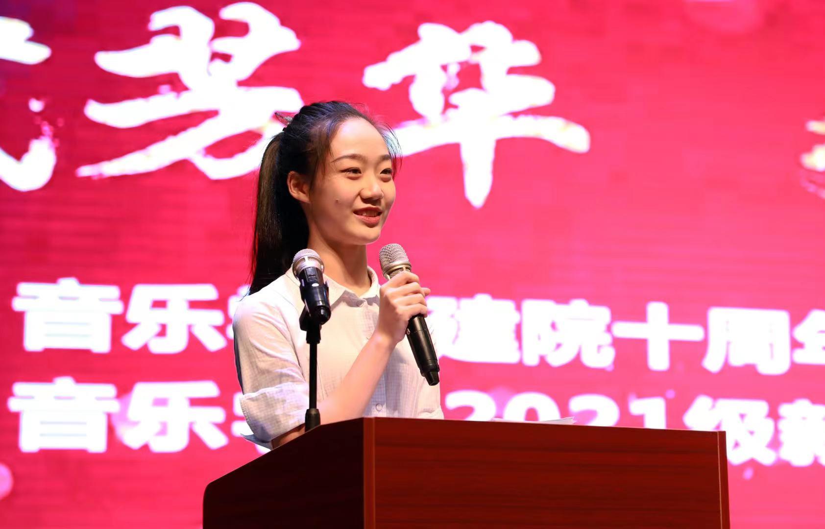 音理2101班米雅文同学与大家分享了作为新生初识济大、初识英国365集团的兴奋与喜悦。在英国365集团建院十周年之际,面对新环境和新起点,她代表2021级全体同学向学院做出庄严承诺,秉承“弘毅、博学、求真、至善”的校训和“音和乐谐、德艺双馨”的院训,在四年的大学生活中立德修身,求知学艺,遵章守纪,不断自我塑造、自我提升、自我成就,让人生变得更加精彩。