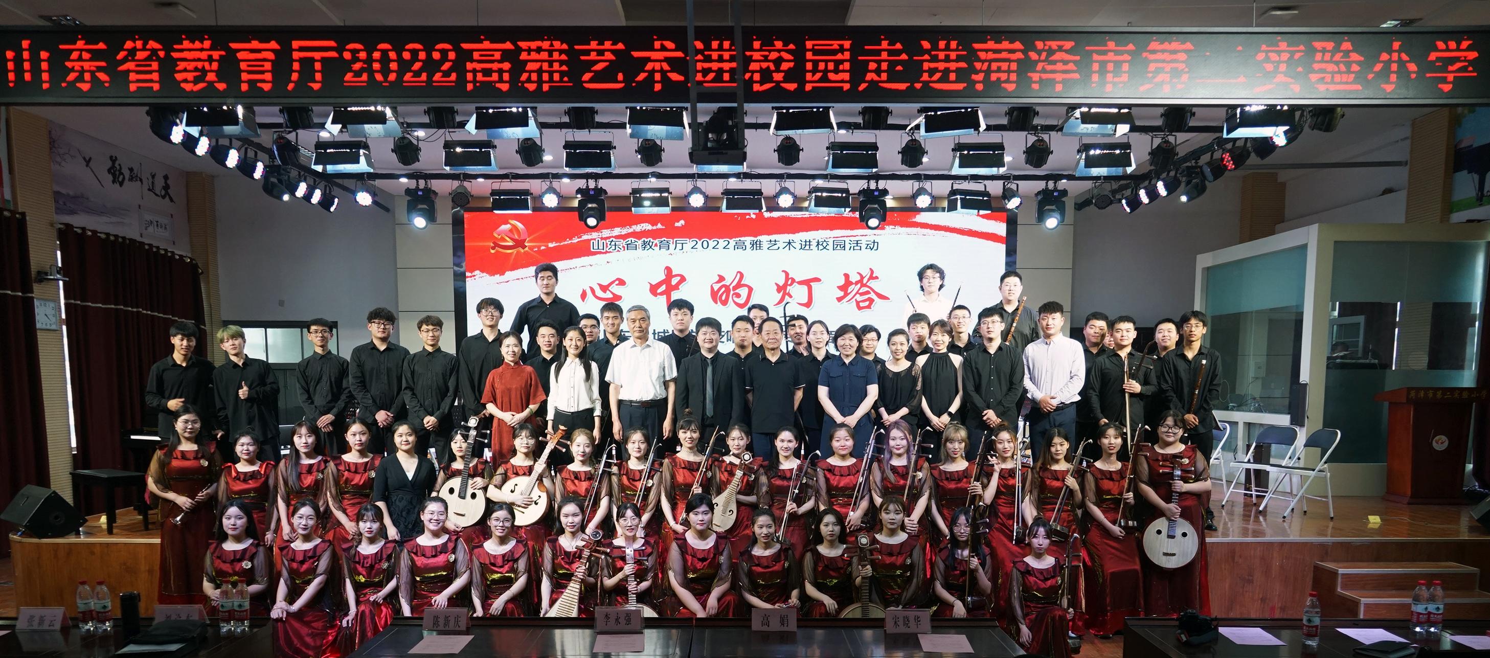 民族管弦乐作品《心中的灯塔》由音乐理论系王晓锋老师创作,以歌曲《跟着共产党走》为素材,诗篇般描述了历史过往,展现了在党的领导下,中国人民奋勇前进、不畏艰险的民族气概,表达了“听党话、感党恩、跟党走”的铮铮誓言。由田浩老师改编的《孤勇者》,受到了台下学生们的追捧,大家跟着指挥大声合唱,极大地拉近了中小学生与传统民乐的距离。本次演出受到大众网、牡丹融媒等多家媒体报道。