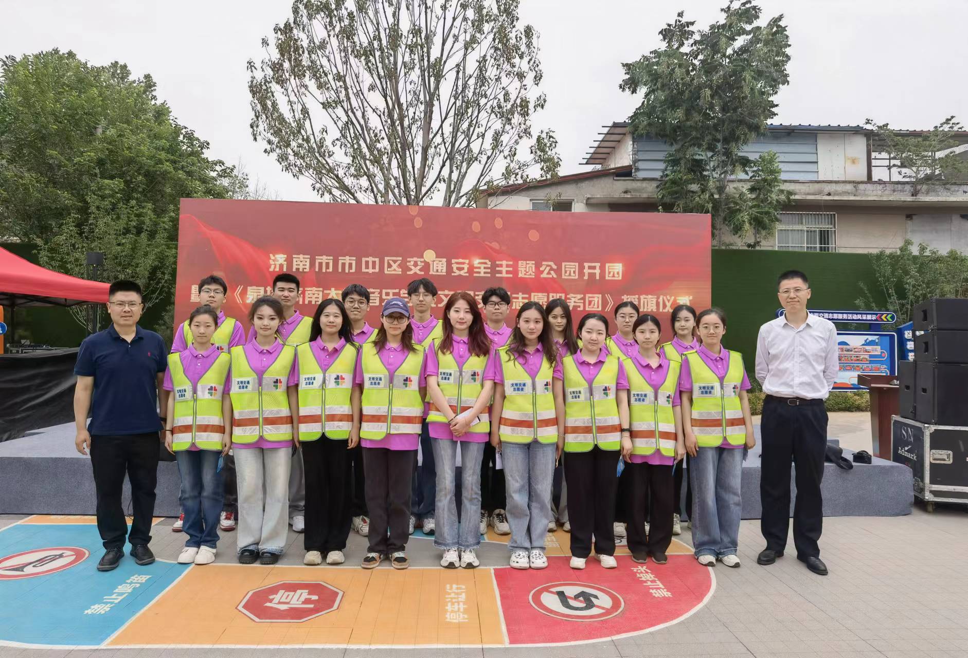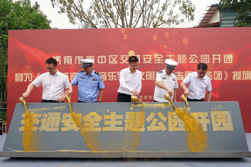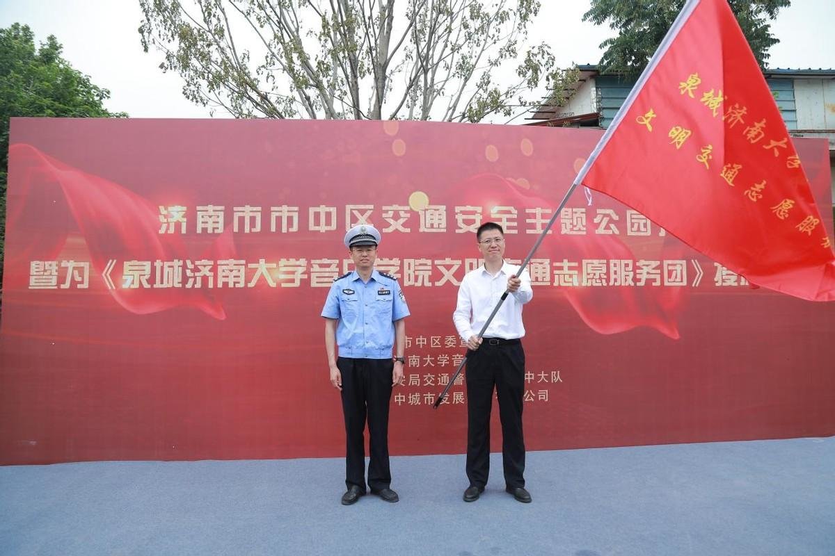 活动现场,尹治国处长为“英国365集团泉城文明交通志愿服务团”授旗。与会领导集体上台剪彩,宣布济南市市中区交通安全主题公园正式开放。