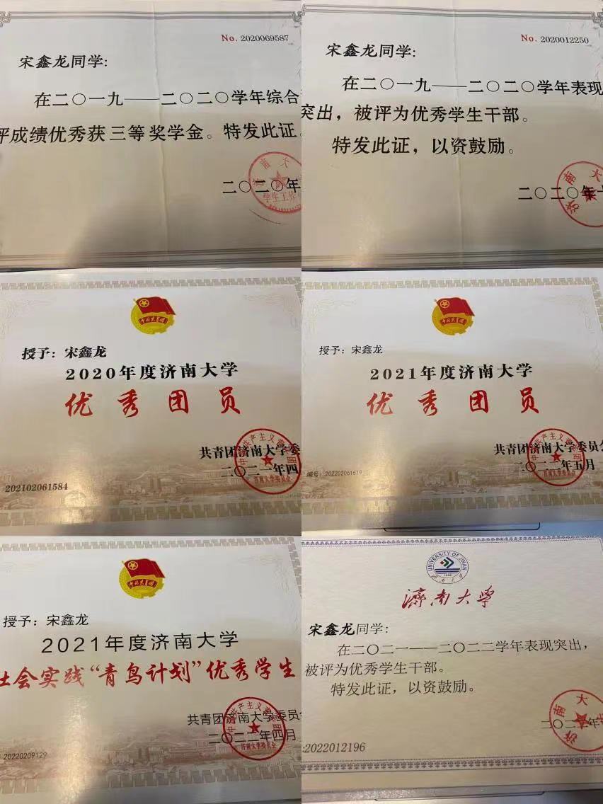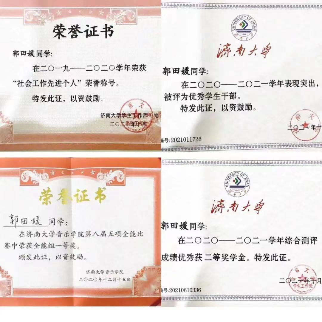2020—2021学年:获得365英国上市二等奖学金、优秀学生干部、五项全能综合一等奖、山东省第六届大学生艺术展演活动一等奖