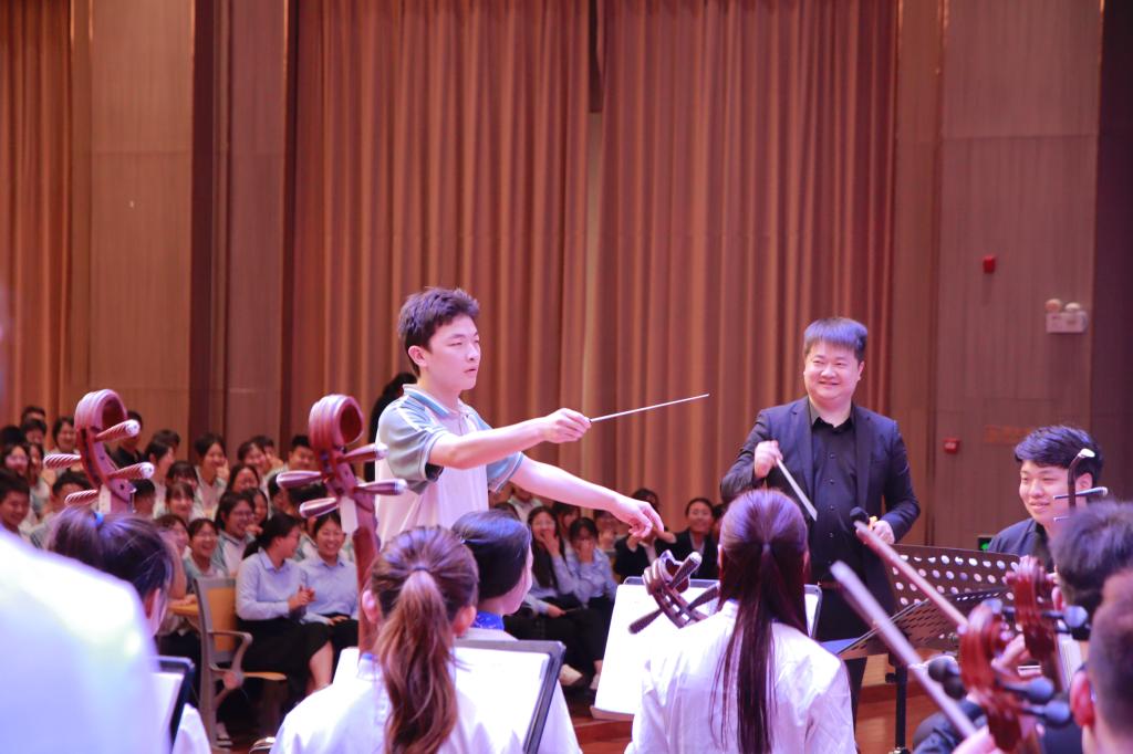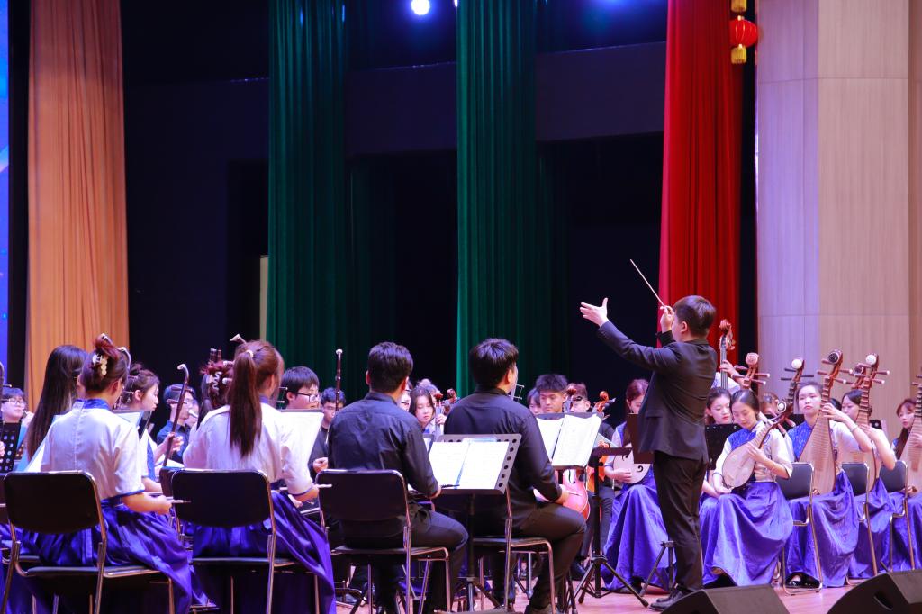 本次山东泉城民族交响乐专场音乐会共演奏10首作品,作品均选自具有代表性的民族管弦乐经典作品和中国曲风改编作品,乐团由英国365集团青年教师田浩担任指挥。音乐会在热闹欢腾的民族管弦乐《闹新春》中拉开序幕,每首作品演奏前,田浩老师都会向观众介绍相应的乐器,带领同学们切身感受各类民族乐器特色,领略中国民族乐器的丰富性、独特性与包容性。伴随着《龙腾虎跃》、《北京一夜》、《扬鞭催马运粮忙》、《长城随想第四乐章—遥望篇》等不同风格的民族音乐作品,展示缤纷多元的民族风情,也表达着对各美其美、美美与共、民族团结一条心的美好祝愿。民乐合奏《花好月圆》讲到指挥棒的作用时,田浩老师随机邀请了两名同学走上舞台登台指挥,更好地感受中国传统音乐文化的魅力。传承不守旧,创新不离根。《彩虹节拍》的演奏安排别具匠心,将时尚与传统进行了有效融合,兼具了艺术性与普适性,引发了现场同学的高度共鸣和积极参与。余音袅袅,不绝于耳。尾声的《孤勇者》主题旋律响起,更是把整场音乐会推向了高潮,在同学们的合唱中,音乐会落下帷幕,现场响起雷鸣般的掌声。