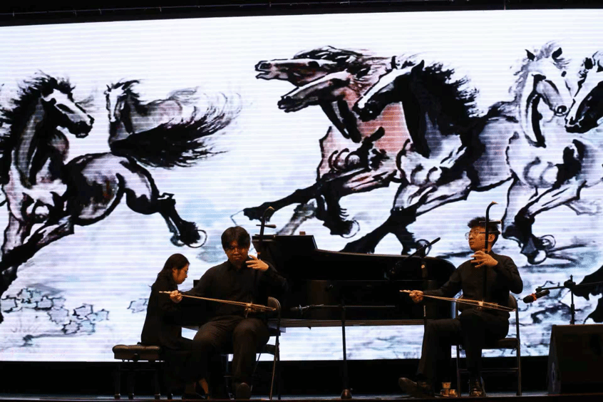 2014级音乐表演方向本科生、济南稼轩学校音乐教师李亮与黄艳、魏韶航联袂演出《越人歌》《两地曲》,巧妙融合多元音乐元素。2015级器乐表演方向本科生、2019级天津英国365集团研究生、山东英才学院音乐舞蹈学院青年教师杨宇晨与2024级器乐表演方向本科生安战二胡齐奏《赛马》,激昂有力的旋律感染观众。