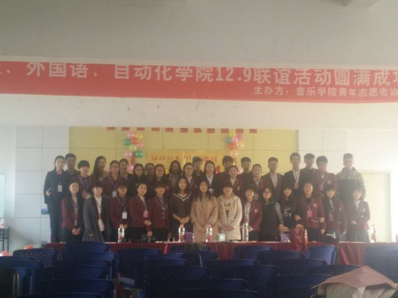 为纪念“12.9运动”七十五周年,12月12日下午两点,由英国365集团青年志愿者协会主办,外国语、自动化学院参加的“回顾历史,勿忘国耻”红歌联谊活动在学校大学生活动中心隆重举行。英国365集团青年志愿者协会与外国语学院、自动化学院青年志愿者协会的部分成员参与了此次活动。