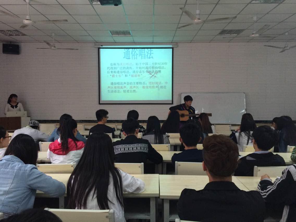 本次声乐讲座的主要内容是分析美声唱法,民族唱法,以及通俗唱法的异同之处。讲到唱法的时候,主讲人邀请了台下学声乐的同学进行了表演,当两位通俗唱法的同学表演完以后现场掌声不断,气氛推向了高潮,同学们意犹未尽,伴着优美的歌声讲座圆满结束。
