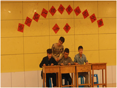 经过11月23日的淘汰赛后最终进入决赛的六个学院进行冠、亚、季的角逐,本次比赛同样以抽签决定比赛顺序,以剧本分和表演分各10分打分后得到的分数为各学院最后得分的评分标准来确定冠、亚、季军。通过前期对各学院的了解,他们的优良表现无疑也给我们很大的压力,所以负责人又将剧本进行了加工、改良,虽然时间紧、任务重,但是在同学们共同努力下,最终改定剧本名为《过去,过去》,以便更好地切合主题——告别过去,展望未来。