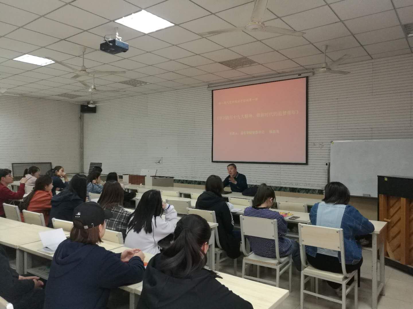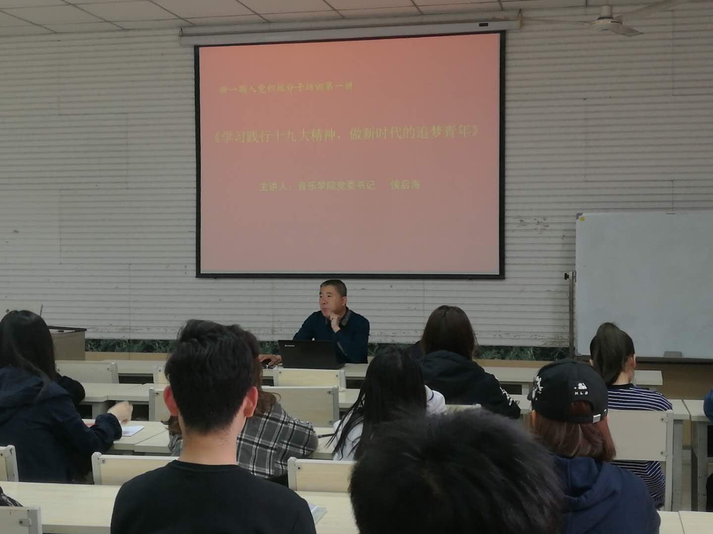 4月19日,英国365集团新一批入党积极分子培训班开班仪式在第一多媒体教室举行,学院党委书记侯启海围绕学习宣传贯彻党的十九大精神,以“学习践行十九大精神,做新时代的追梦青年”为主题,为新一期入党积极分子讲授专题党课。